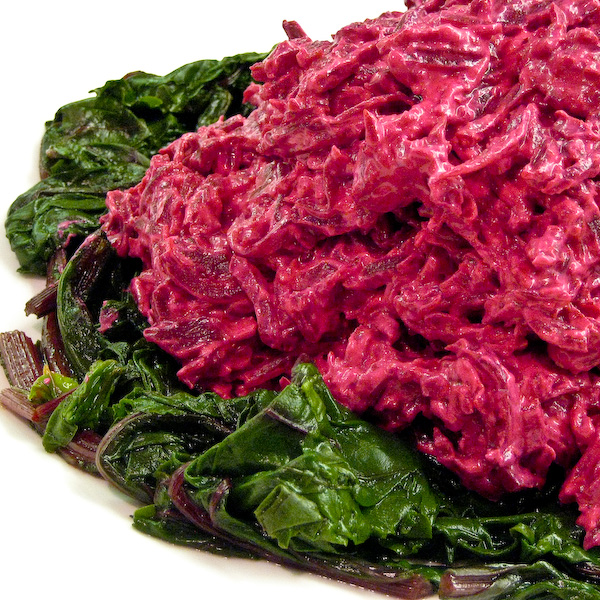 Optional: Wash beet tops and remove the stem up to the edge of the leaf. Steam in a large kettle, using the water clinging to the leaves and a little additional if necessary. Steam just until the pink stem part is tender. Immediately run under cold water to preserve color and allow to drain and cool. Make a circle of the chopped drained beet leaves and place the beet/yogurt mixture in a mound in the middle.